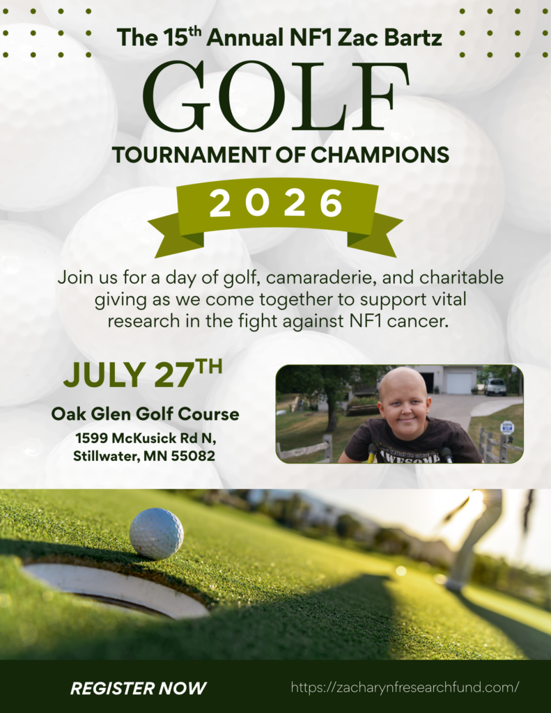 For 15 years, the Zachary NF Research Fund has hosted an annual golf tournament. All proceeds are donated directly to the University of Minnesota’s NF and cancer research lab.