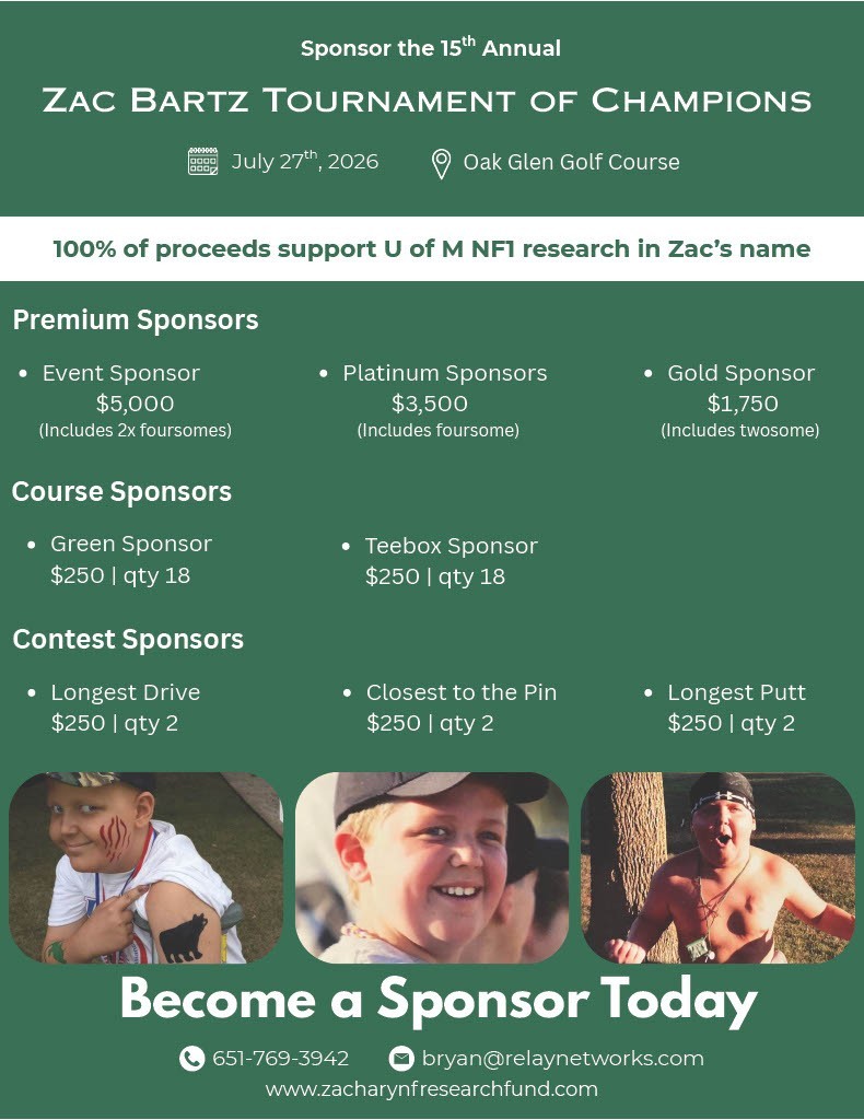 For 15 years, the Zachary NF Research Fund has hosted an annual golf tournament. All proceeds are donated directly to the University of Minnesota’s NF and cancer research lab.